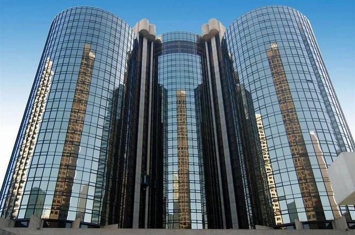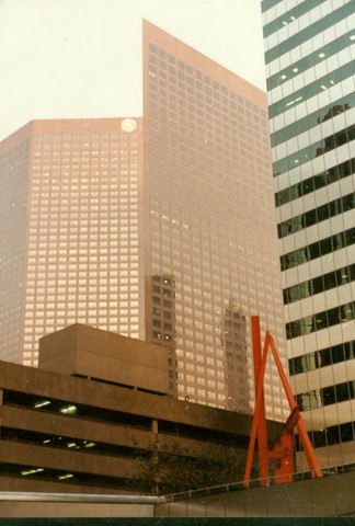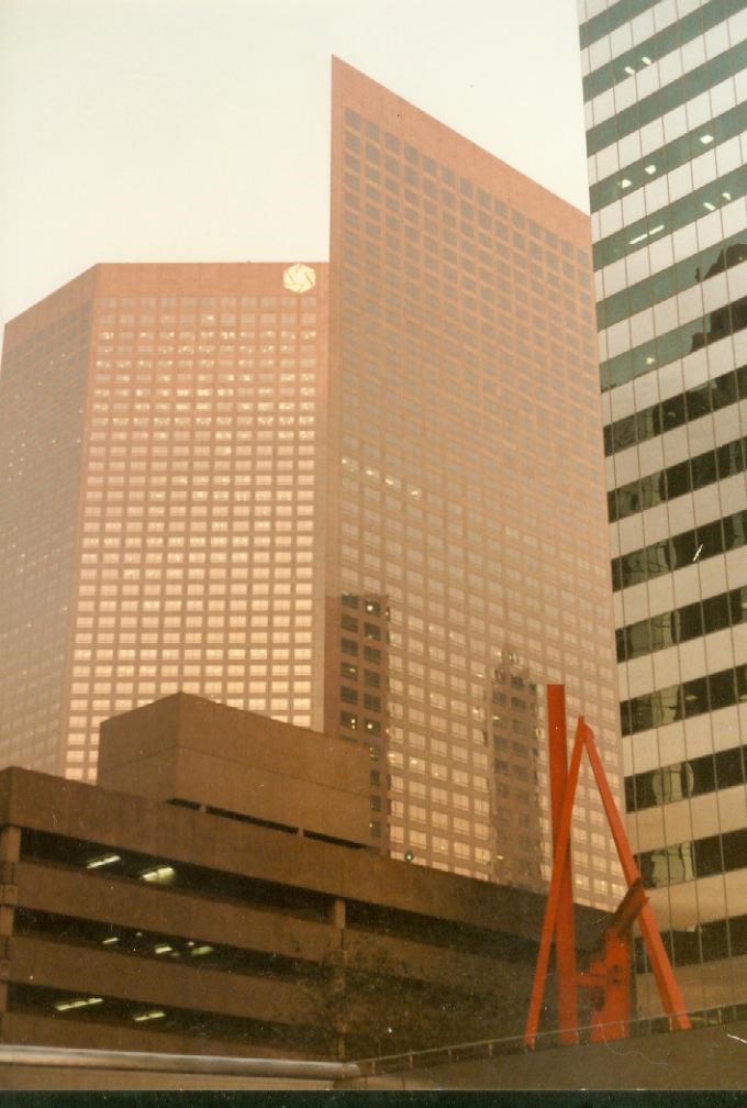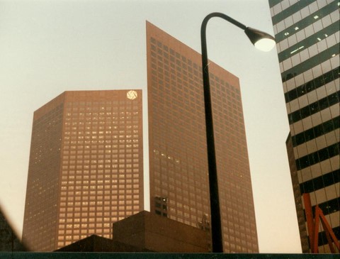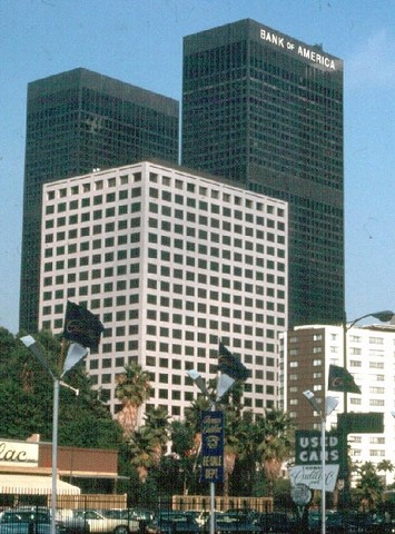 JM used to work there, at Credit Lyonnais on the 35th floor of the Bank of America tower. Just across the street was the Bonaventure Hotel, where many sci-fi conventions were held. (I interviewed Anthony Daniels (C-3PO there.) There is an odd illusion of perspective... The building in the center of the photop looks flat, like a giant credit card standing on its edge...