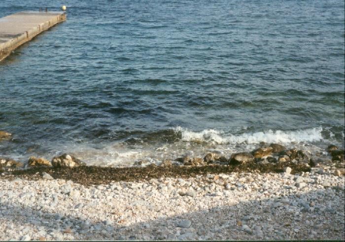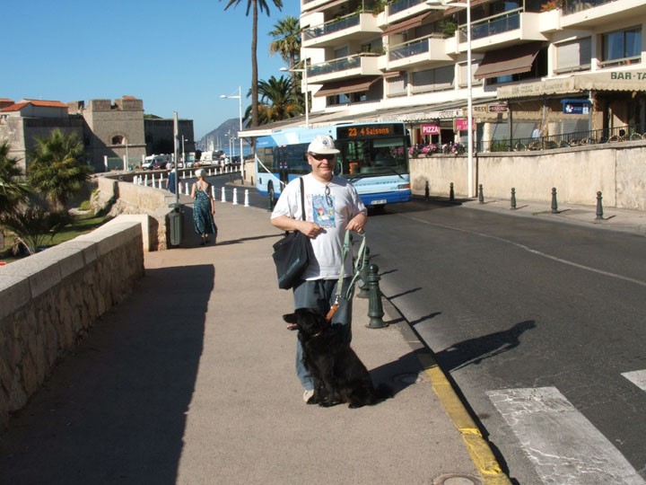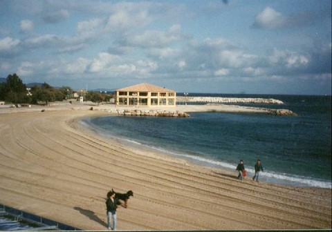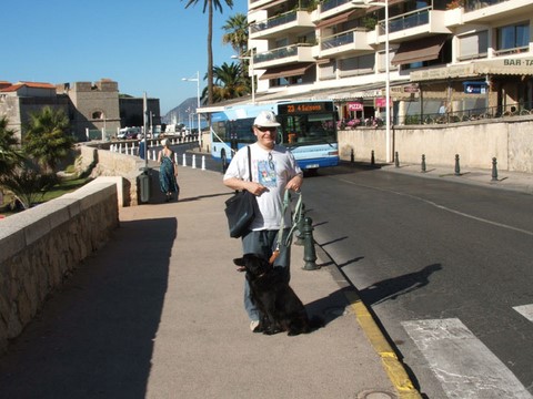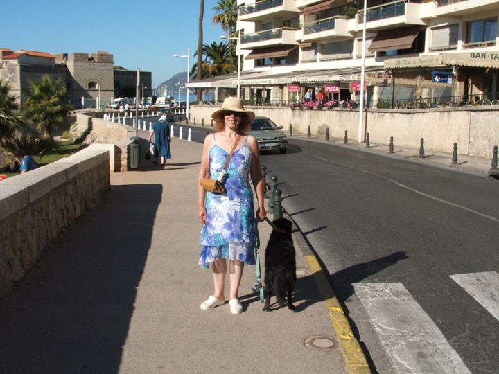 Le Mourillon is one of the districts of the harbor city of Toulon. Jean-Marc liked to walk on the Corniche by the beach with Diva Maggie McMiggins (pondering the injustice of no-dogs-allowed-on-the-beach signs -- unlike the folks in one of the 1999 photos, we did not break the law. Randy also promenaded with Diva. Even though it was around 9:30 a.m., the sun was very strong.